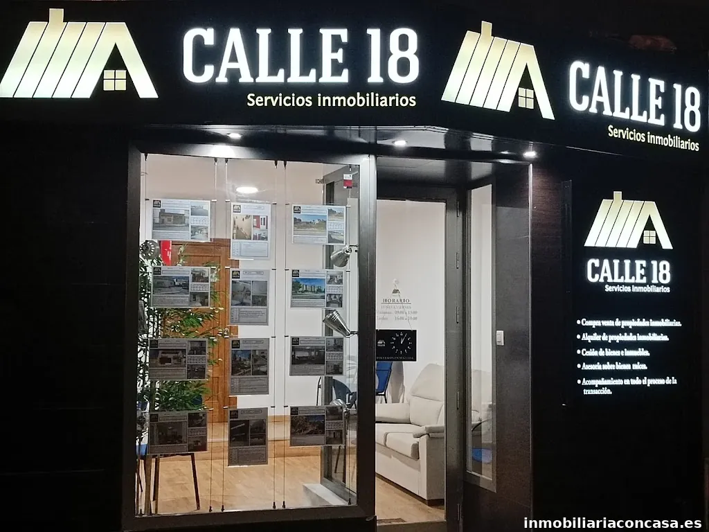 Calle 18 servicios inmobiliarios, es un negocio que se dedica a la intermediación inmobiliaria, esta ubicado en la calle Santiago Ramón y Cajal 172 Bajo